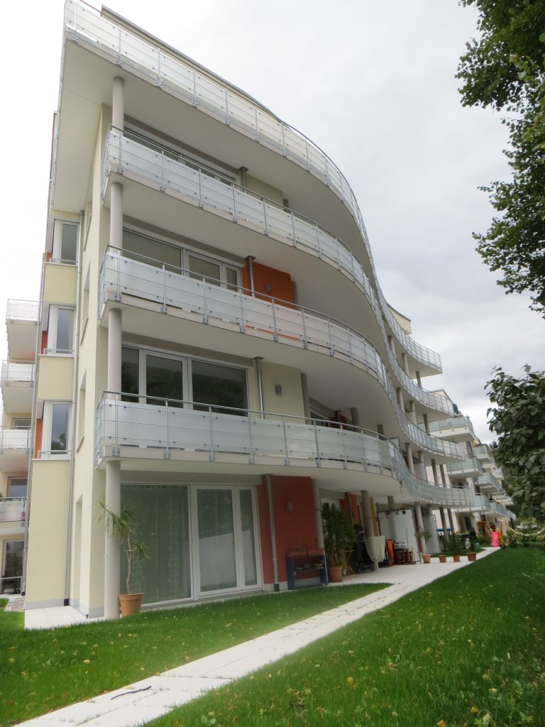 Unser Bild zeigt die geschwungene Südfassade von Haus V10