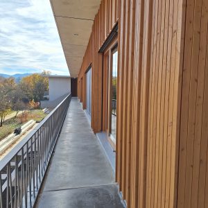 Der Neubau kombiniert robuste Stahlbetonwände mit hochwertigen, gedämmten Fassadenelementen in Holztafelbauweise. Akzente setzt eine elegante Metallfassade aus Aluminiumleisten, die ebenfalls in unserem Auftrag beinhaltet war. Die mit Steinwolle gedämmten Holzrahmenelemente erhielten eine vertikale Leistenschalung aus Oregon Pine – mit feinem Bandsägeschnitt, gebrochenen Kanten und variablen Ansichtsbreiten von 30 und 60 Millimetern. Das warme Holzbild verleiht der modernen Architektur eine natürliche, lebendige Note.