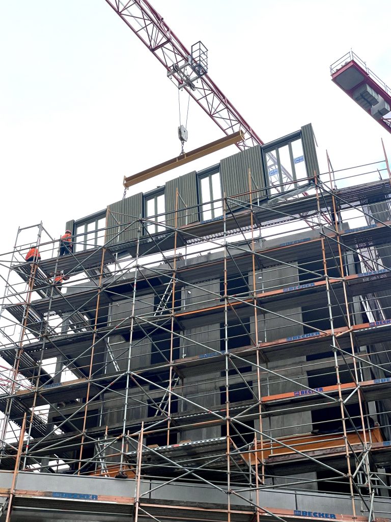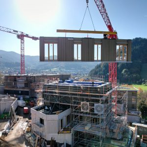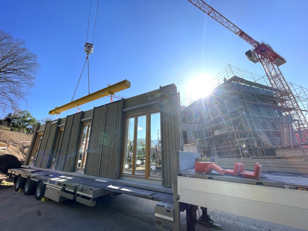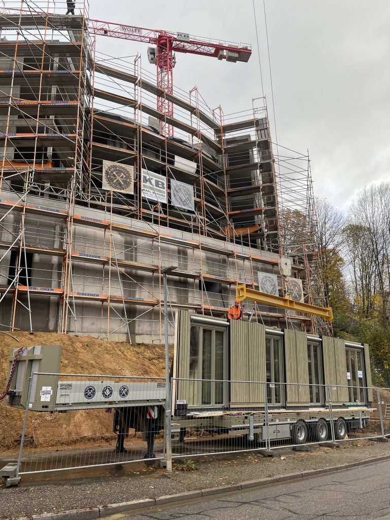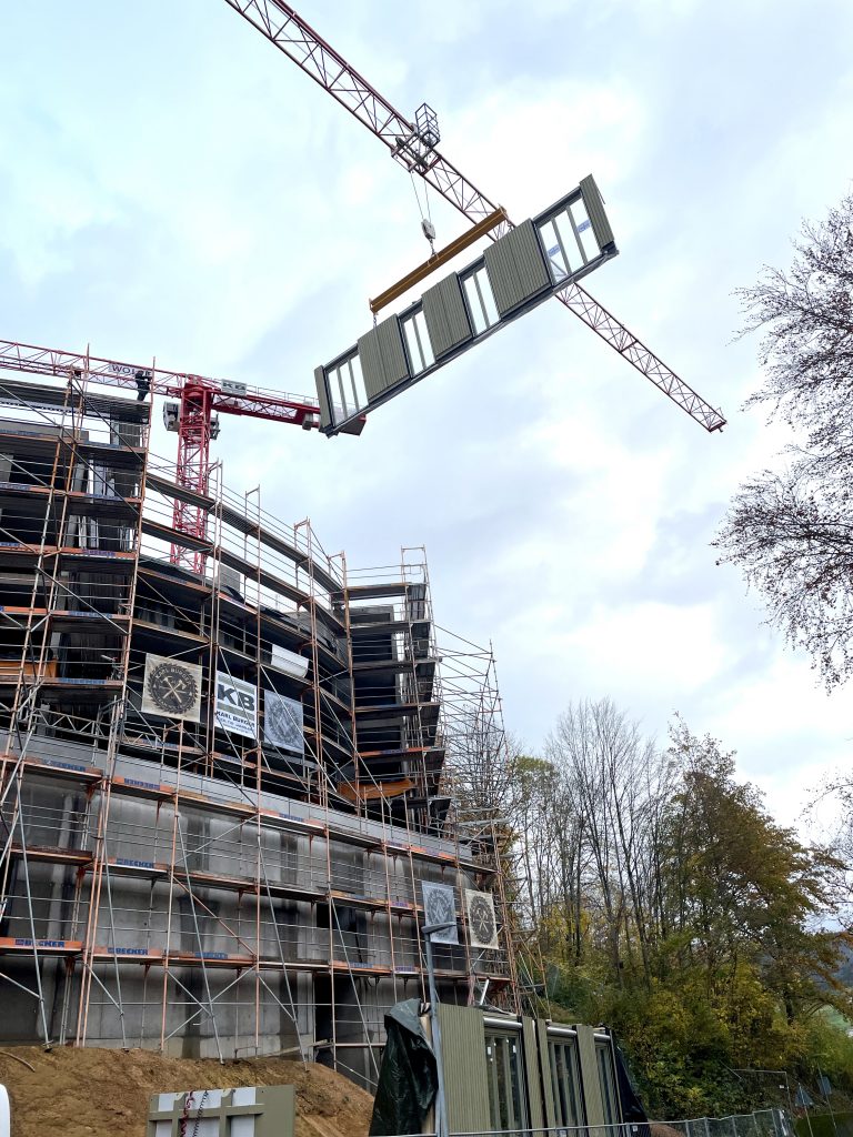 Unsere eigene Logistik ermöglichte eine flexible und stets „just in time“-Lieferung, wodurch der Bauablauf reibungslos und effizient verlief. Dieses Projekt zeigt eindrucksvoll, wie modernes, serielles Bauen mit Holz höchste Qualität, Effizienz und Ästhetik vereinen kann.