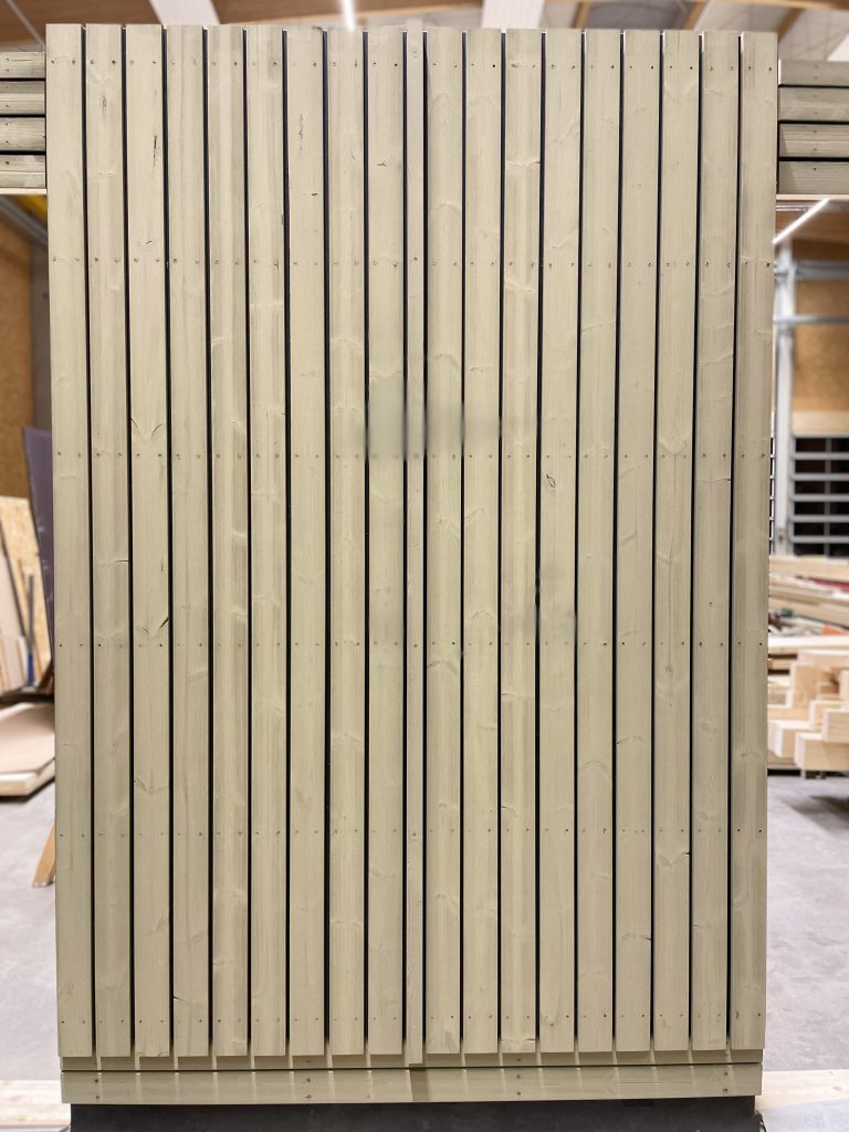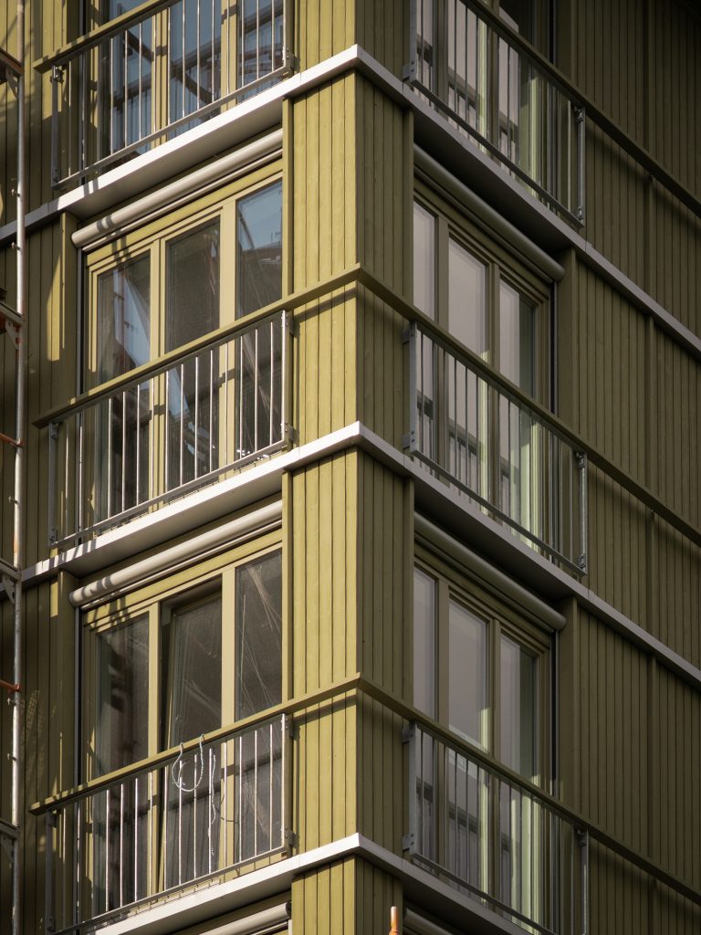 Die hinterlüfteten Fassaden, ausgestattet mit vertikal angeordnetem, thermisch behandeltem und mineralisch beschichtetem Nadelholz, wurden in möglichst große Elemente unterteilt, um den Bauablauf zu optimieren. Bereits in unserem HolzElementWerk wurden alle Fenster, Brandbleche sowie Absturzsicherungen für die bodentiefen Fenster vormontiert – alles in seriellem Fertigungsverfahren.