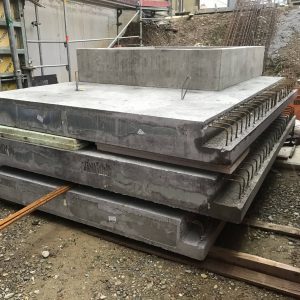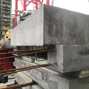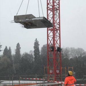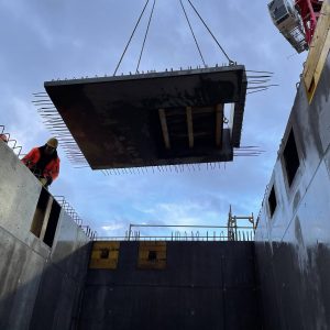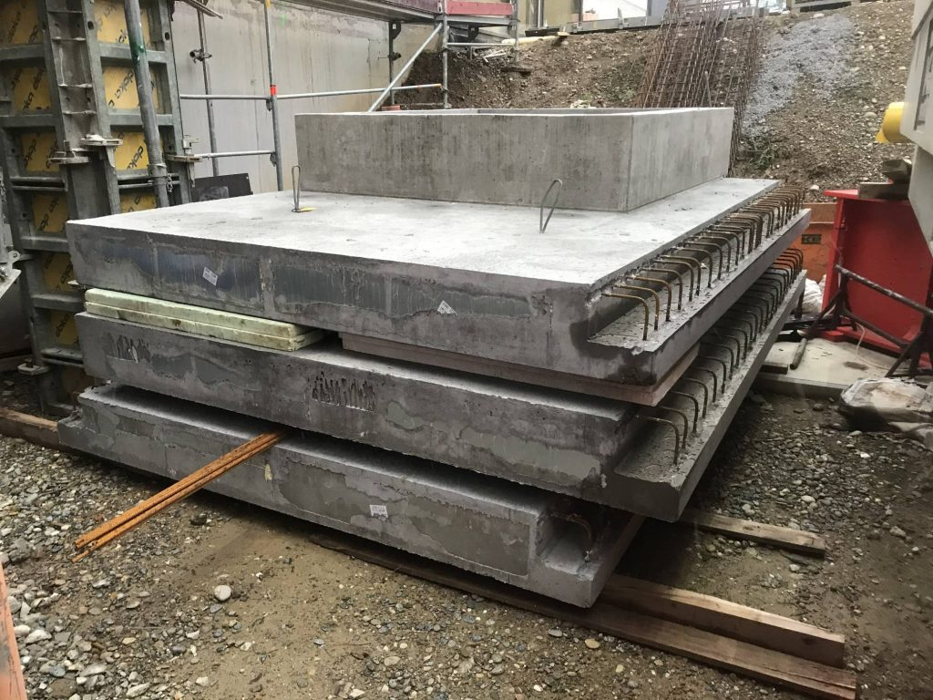 Für die Abdeckung und gleichzeitige Ausbildung der Flachdachdecke über einem mehr als 20 m hohen Versorgungsschacht fertigten wir mehrere Schachtdeckelelemente als massive Betonfertigteile. In einem der Elemente wurden die Entrauchungsöffnung einschließlich erforderlicher Aufkantung sowie die Absturzsicherung bereits werkseitig integriert und vormontiert.