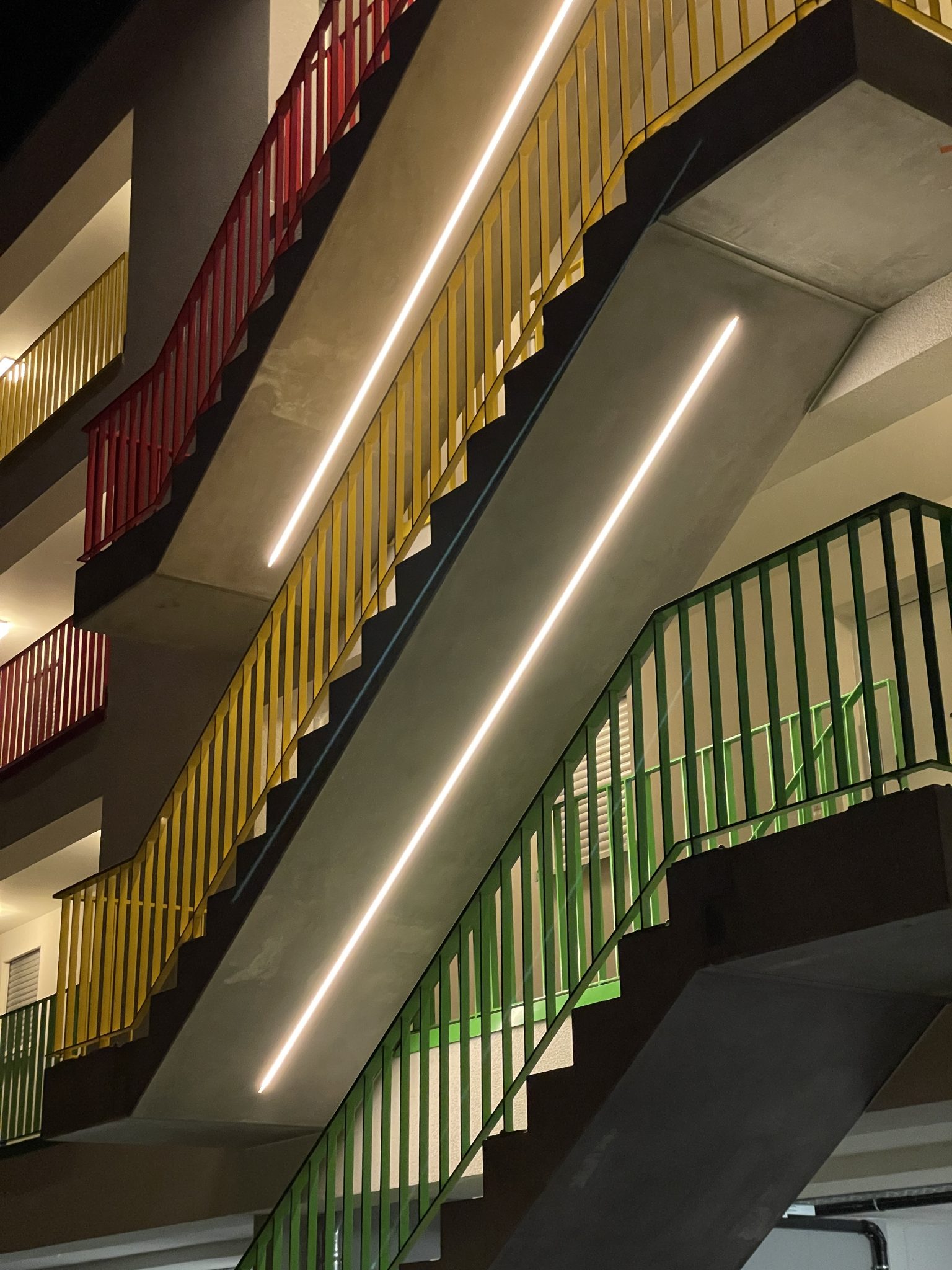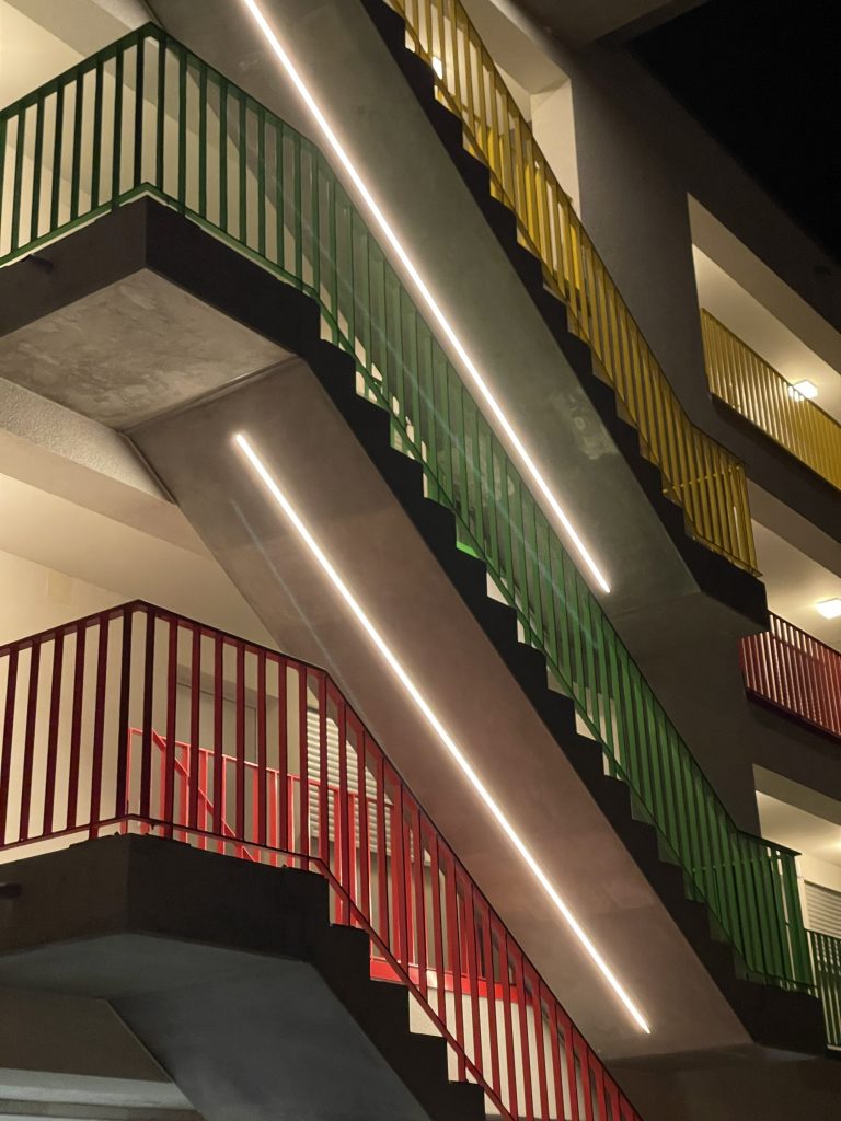 Eine besondere Herausforderung stellte die teilweise in die Untersichten der Treppenläufe integrierte LED-Lichtlinie dar, die bereits im Fertigteilwerk präzise berücksichtigt wurde.