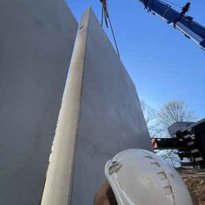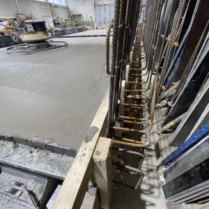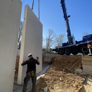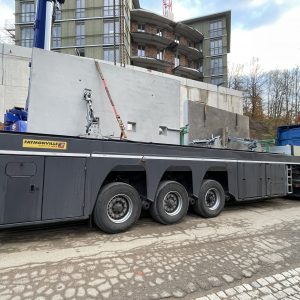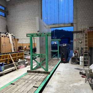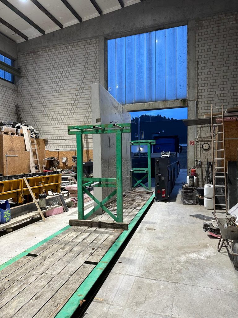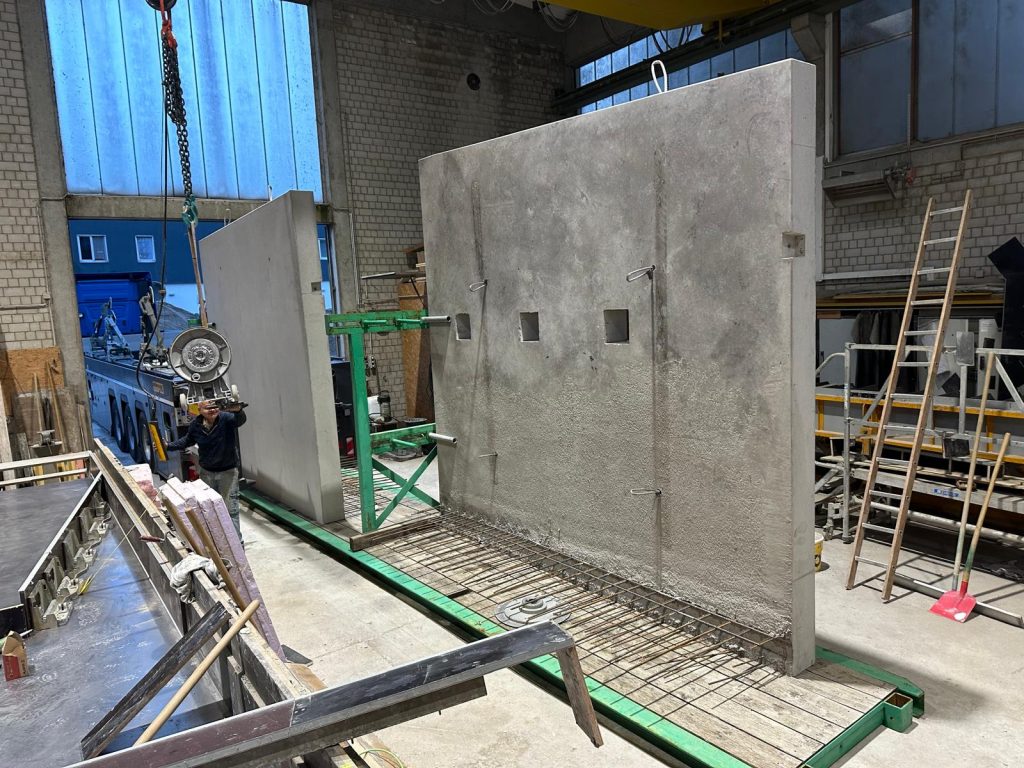 Auch geometrisch anspruchsvolle Wandbereiche, wie das Eingangsportal des Tiefgeschosses, wurden als Vollfertigteile hergestellt und durch gezielte Ortbetonergänzungen zu einem geschlossenen Rahmentragwerk verbunden. Ergänzend wurden in bis zu 4,20 m hohen Wandelementen Aussparungen für eine spätere Begrünung vorgesehen.