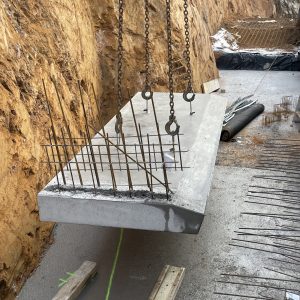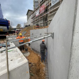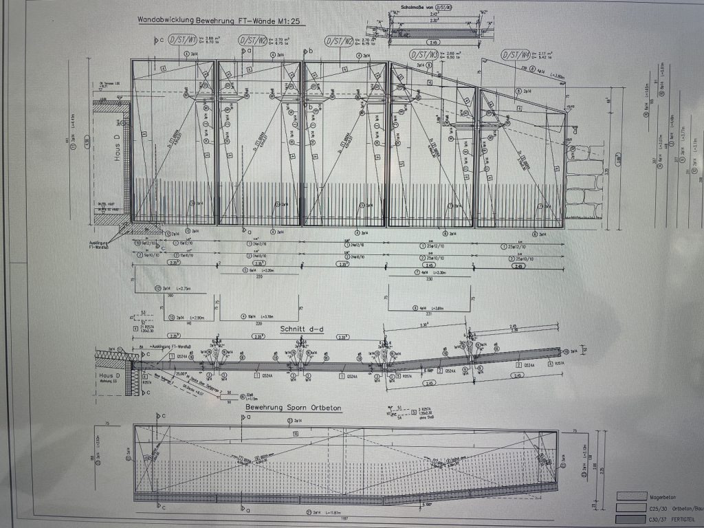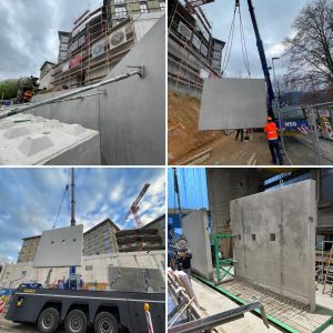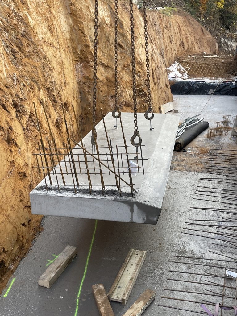 Zur Sicherstellung der gestalterischen Qualität sowie zur Einhaltung eines ambitionierten Bauzeitenplans kamen Vollfertigteilwandelemente zum Einsatz, die vor Ort über Anschlussbewehrung mit einem Ortbetonsporn ergänzt wurden und anschließend die Funktion der Hangstützwände übernahmen. Die Vorfertigung von bis zu 6 m langen Wandelementen im Betonfertigteilwerk ermöglichte dabei eine weitgehend fugenarme Konstruktion.
