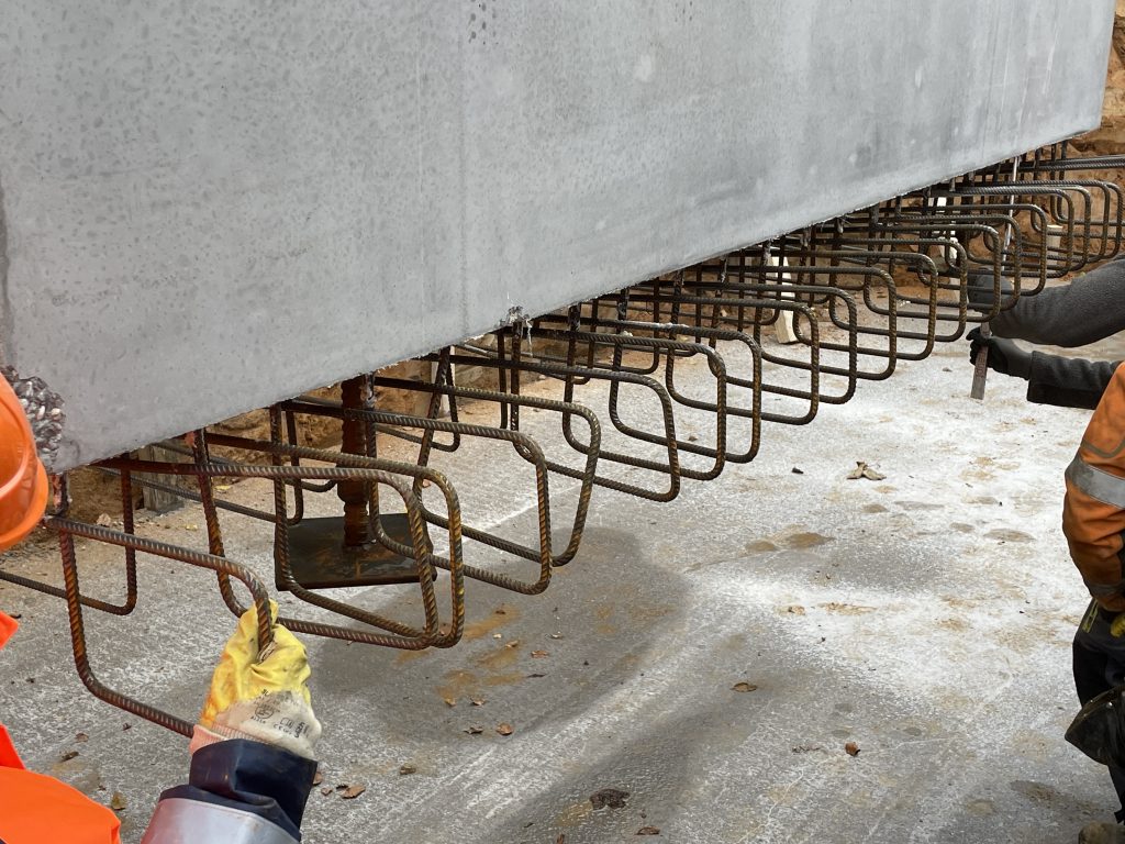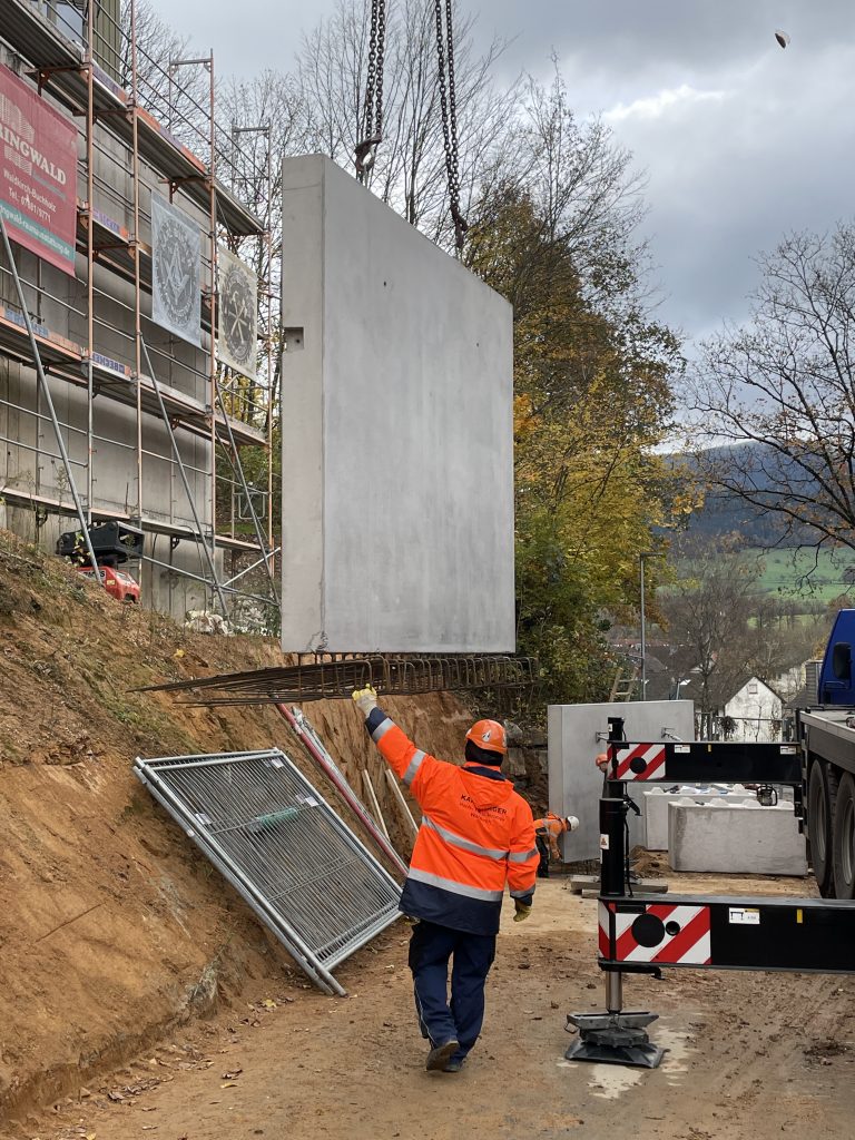 Der hohe Vorfertigungsgrad gewährleistete eine gleichbleibend hochwertige Sichtbetonoberfläche und trug maßgeblich zur Bauzeitverkürzung bei: So konnte eine 12 m lange und 4,20 m hohe Stützwand innerhalb eines halben Arbeitstages vollständig versetzt, ausgerichtet und inklusive Ortbetonergänzung hergestellt werden.