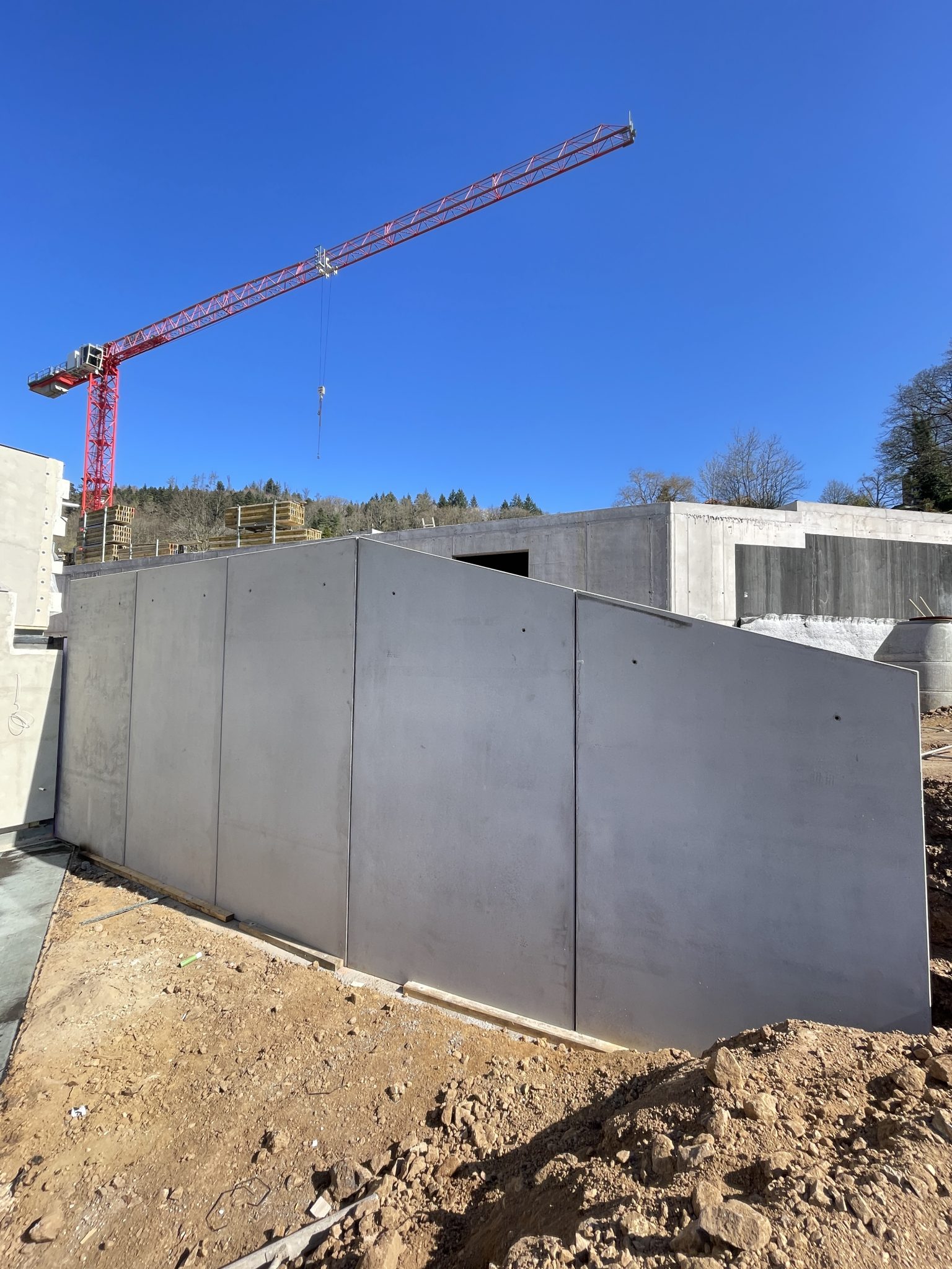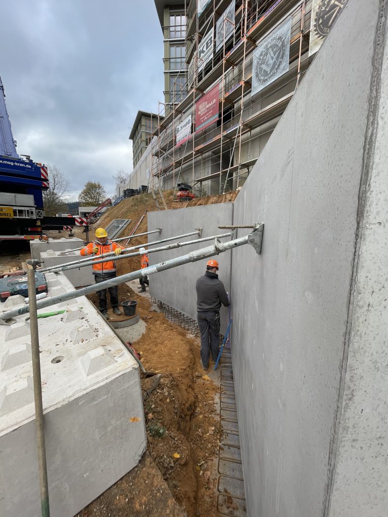 Das Bauen in Hanglagen stellt sowohl in der Planung als auch in der Ausführung besondere Anforderungen an Fachkompetenz und wirtschaftliche Lösungen. Für die barrierefreie Erschließung des rund 5 m oberhalb der angrenzenden Straße liegenden Tiefgeschosses einer groß dimensionierten Tiefgarage im Waldkircher Stadtteil Kollnau wurden insgesamt 105 lfm Stützwände mit Höhen von bis zu 4,75 m erforderlich – bei gleichzeitig höchsten Anforderungen an die Sichtbetonqualität der Oberflächen.