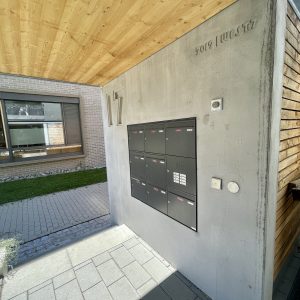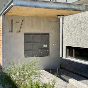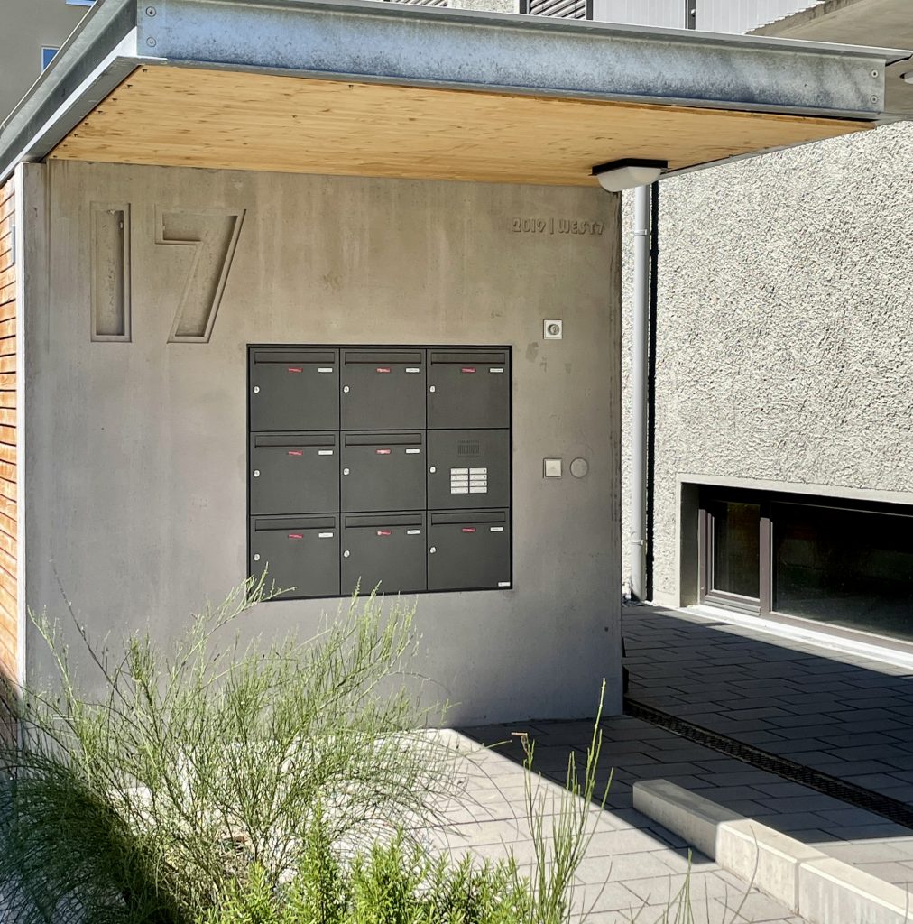 Dabei handelt es sich um eine Wandscheibe mit integrierter Briefkastenanlage, ergänzt durch den Schriftzug und das Baujahr der WEG sowie eine prägnant gestaltete Hausnummer „17“, die das Erscheinungsbild der Anlage markant prägt.