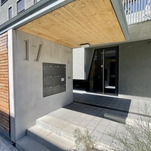 Das massive Wandfertigteil wurde in unserem Werk hergestellt und vor Ort montiert. In Kombination mit der auskragenden hölzernen Dachkonstruktion entsteht ein architektonisch ansprechender und hochwertiger Eingangsbereich für das Mehrfamilienhaus.