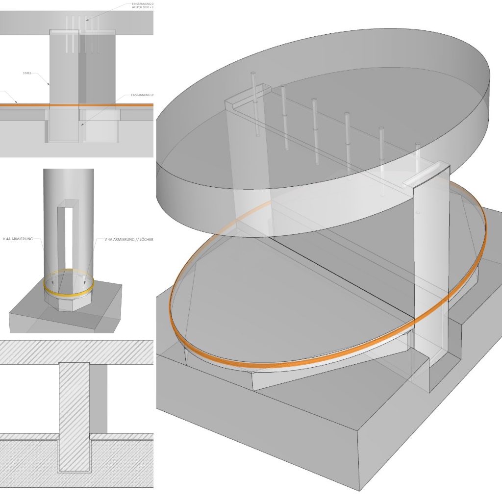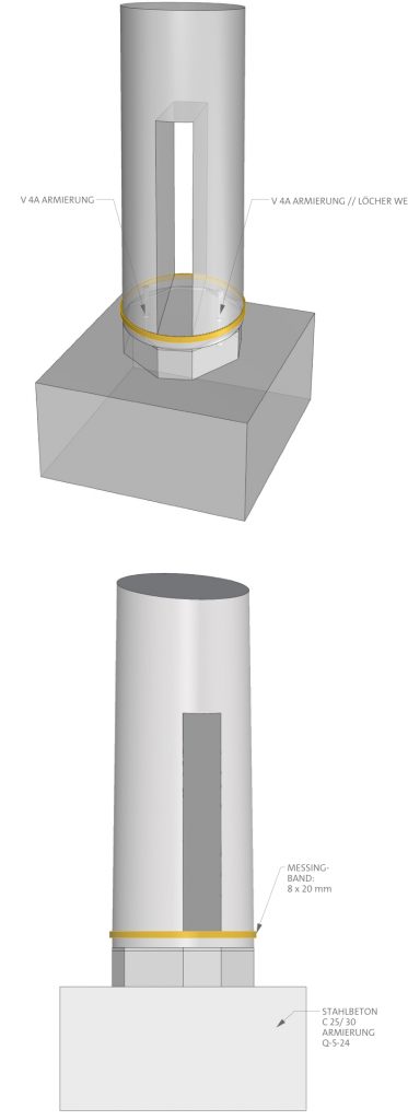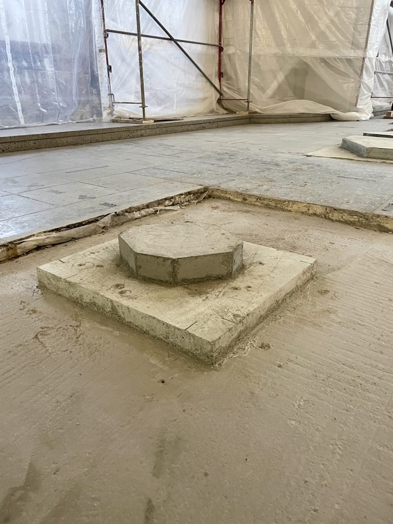 Da die Altarplatte mit elliptischem Grundriss aus massivem Kalkstein gefertigt und mittig auf einer ebenfalls aus Kalkstein bestehenden Trägerscheibe verankert wurde, musste ein speziell angepasstes Fundament mit einer entsprechenden Nut ausgeführt werden. In diese Nut wurde der Kalksteinsockel eingesetzt, exakt ausgerichtet und anschließend mit Vergussmörtel kraftschlüssig vergossen, um die erforderliche Einspannung sicherzustellen.