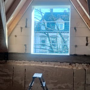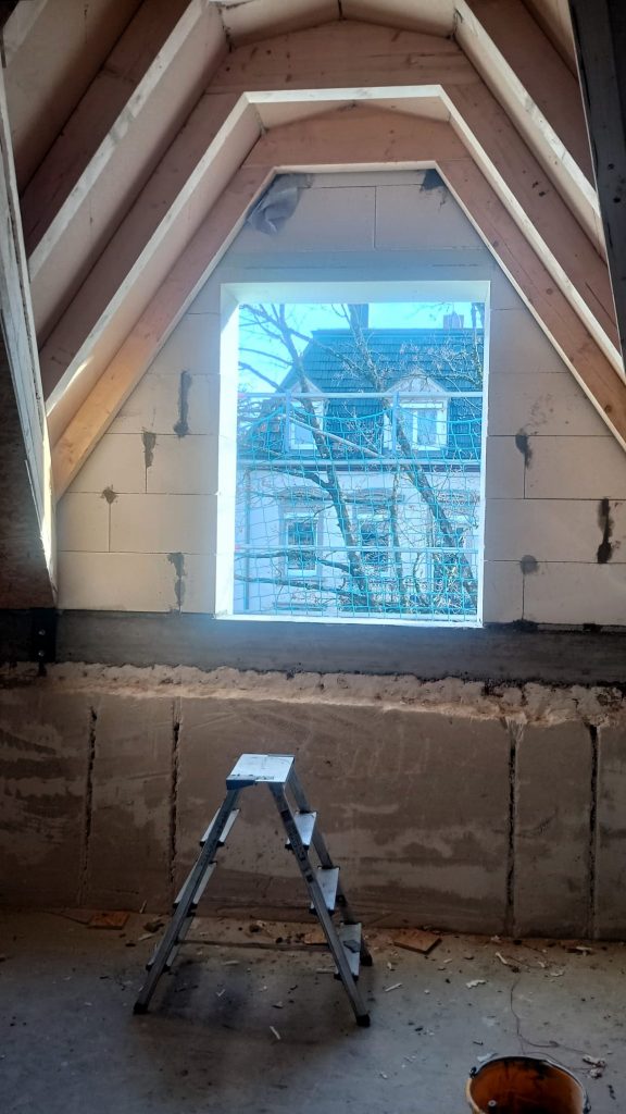 Das Projekt umfasste die Gestaltung der Gaubenwand in Anlehnung an eine Tonnengaube, ergänzt durch eine horizontal abgesetzte Verbreiterung. Nach dem genauen Abstecken vor Ort begannen unsere Experten mit dem Mauern der ersten Schichten. Besondere Sorgfalt galt dabei der exakten Einteilung der Steine, um den Halbkreis der Gaube und die geplante Fensteröffnung präzise umzusetzen.