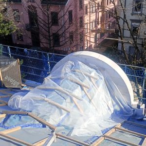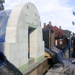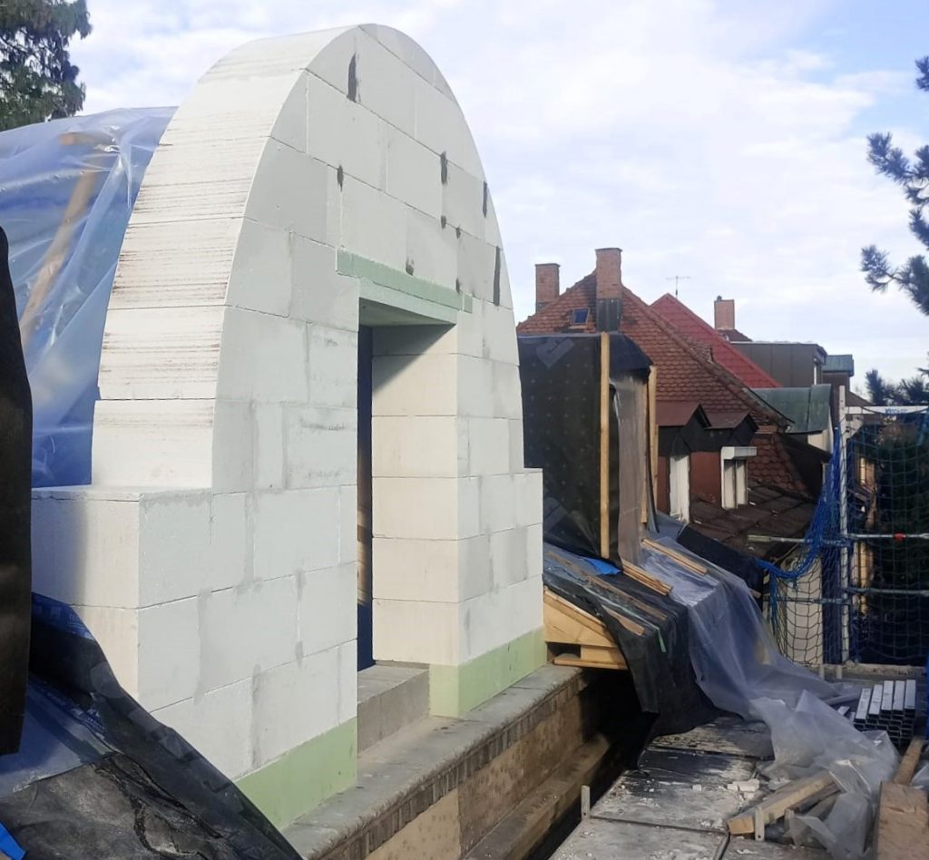 Nach dem behutsamen Rückbau der bestehenden, in die Jahre gekommenen Struktur bis auf die Dachgesimssteine errichteten wir eine neue Stahlbetonschwelle. Auf dieser Grundlage wurde die Giebelwand aus Porenbeton präzise nach den architektonischen Anforderungen aufgebaut.