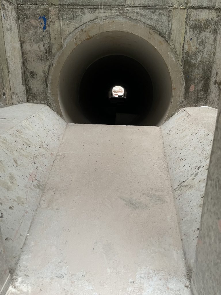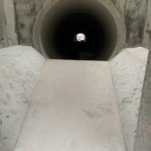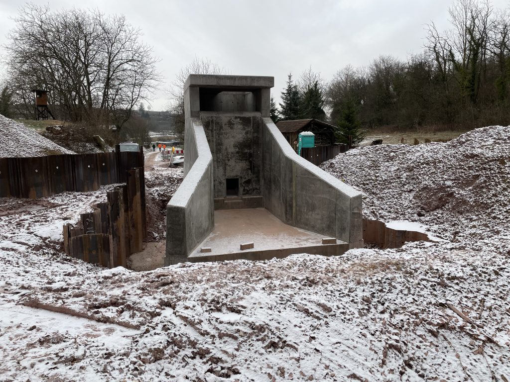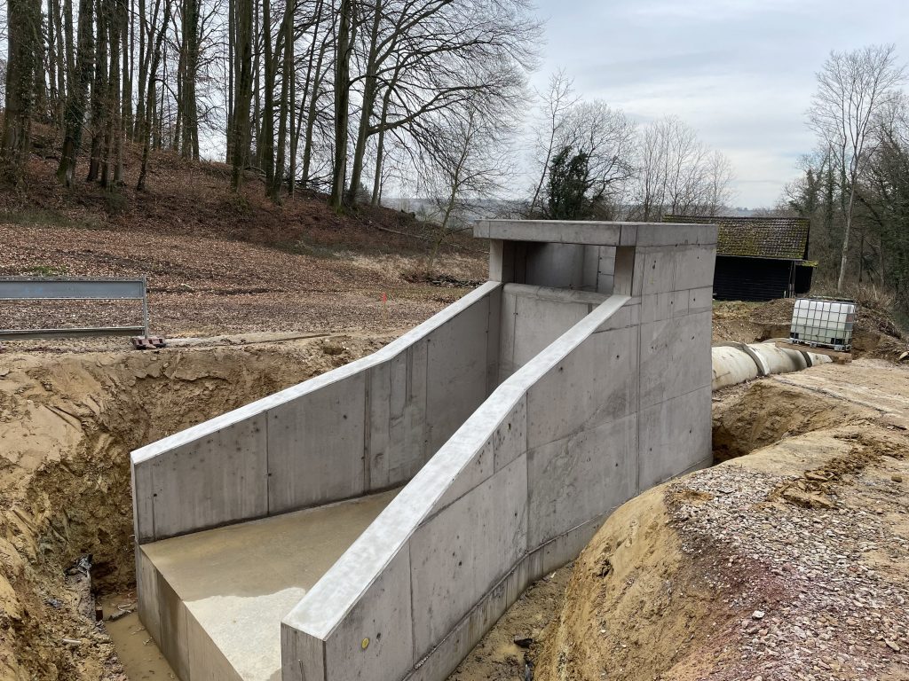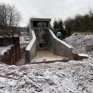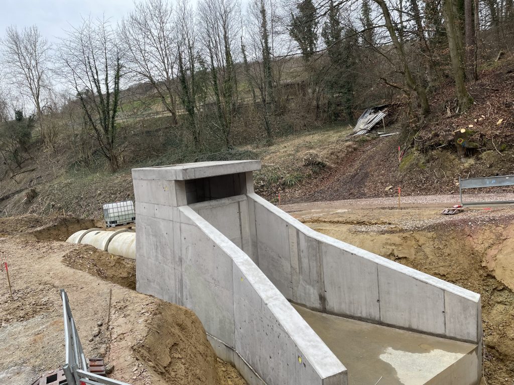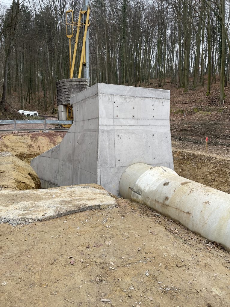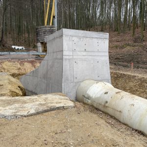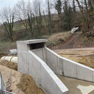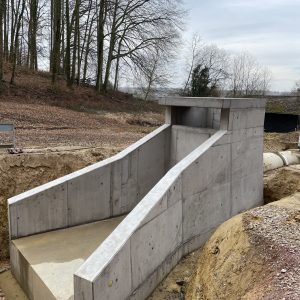 Im Zuge umfangreicher Arbeiten zur Verbesserung des Hochwasserschutzes der Gemeinde Nordweil erstellten wir zwei Geröllfangbauwerke. Die Ingenieurbauwerke aus Stahlbeton wurden an zwei verschiedenen Stellen in gespundeten Baugruben errichtet. Dank akribischer Schalungsplanung der aufwendigen Geometrien durch die Kollegen in der Arbeitsvorbereitung konnte das Team vor Ort das Augenmerk unter anderem auf die handwerklich zu erstellenden meterhohen Einlagen in den aufgehenden Wandschalung richten. Eine weitere Herausforderung waren die Schalarbeiten um die bereits verlegten Großrohre aus Stahlbeton sowie derer wasserdichter Anschluss an die Ortbetonstrukturen.