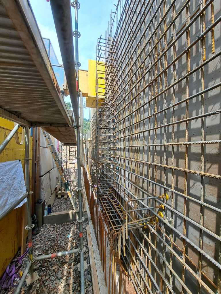 Im weiteren Bauablauf galt es, sehr massive und geometrisch anspruchsvolle Wände sowie Decken aus Stahlbeton zu schalen, zu bewehren und zu betonieren. Diese Bauteile mussten präzise den maschinenbaulichen Anforderungen der Anlagenkomponenten und der Turbine entsprechen, unter Einhaltung strengster Maßtoleranzen.