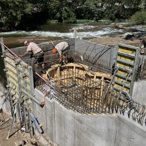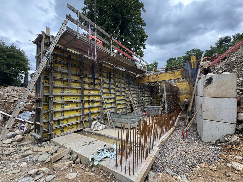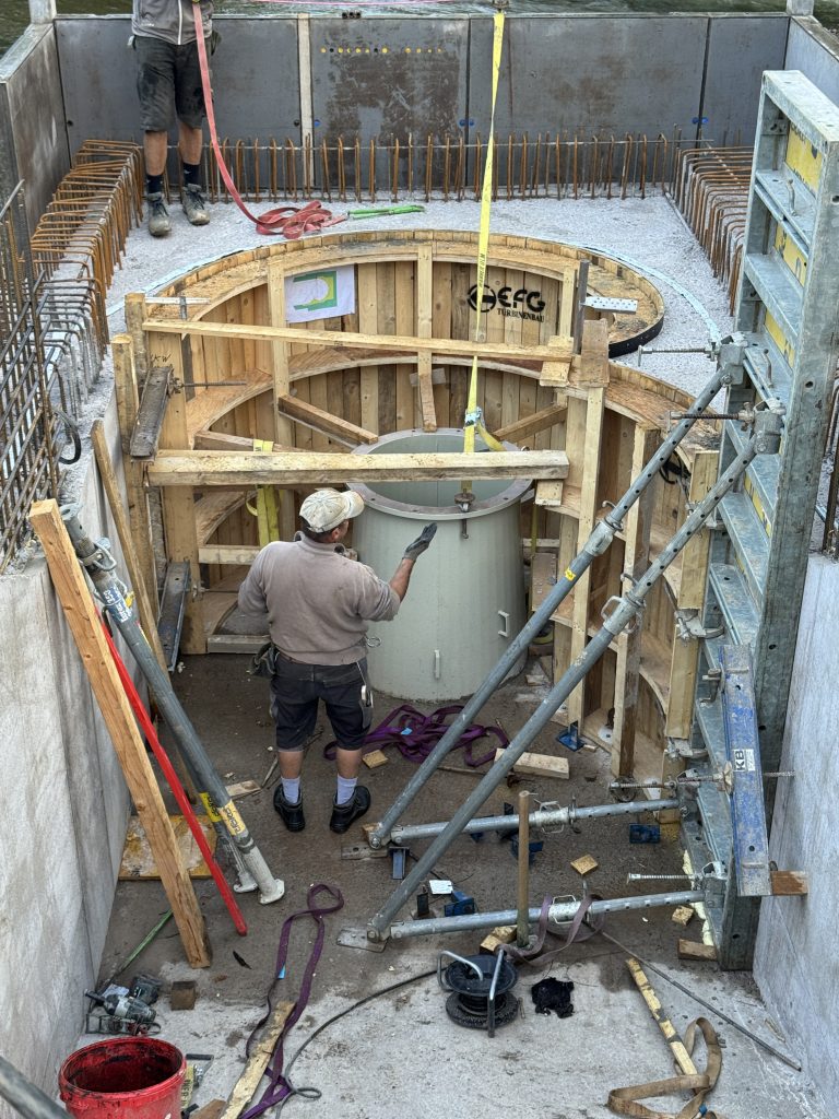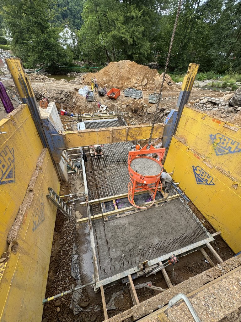 Für den unter dem Wasserstand der Elz liegenden Auslaufbereich des Kraftwerks stand nur ein sehr kurzes Baufenster zur Verfügung. Dieses konnte nur durch einen von uns entwickelten Sondervorschlag zur Ausführung der Baugrube realisiert werden.