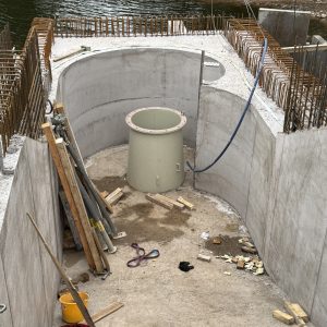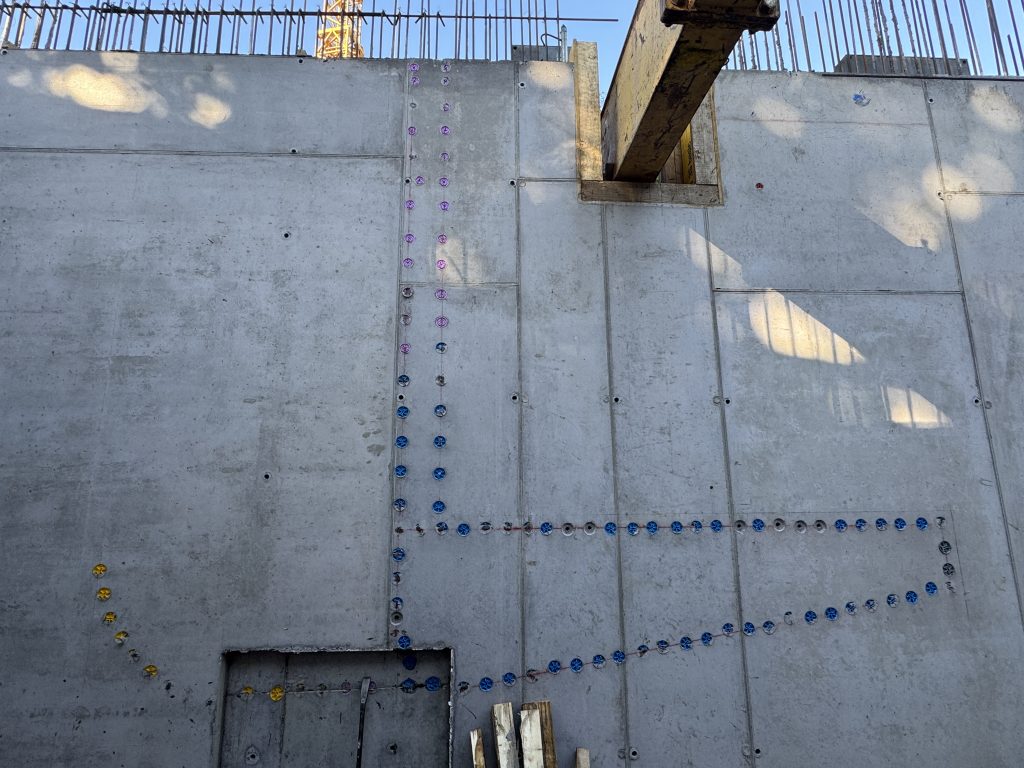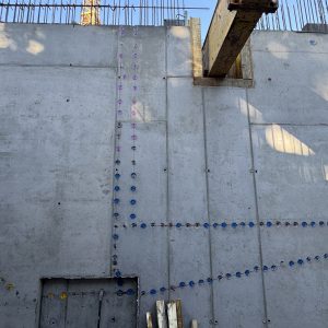 Nach der Ausschachtung – ohne Einsatz spezieller Tiefbautechniken – wurde das in nahezu 8 m Tiefe liegende Bauteil, eine 60 cm dicke Bodenplatte aus Stahlbeton, errichtet. Bereits hier konnten unsere Massivbauspezialisten die Herausforderungen des Ingenieurbaus erfolgreich meistern.