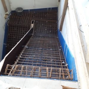 Die beiden im 180°-Winkel zueinander verlaufenden Stahlbetonläufe wurden gemeinsam mit dem Zwischenpodest in einem Arbeitsgang als Ortbetonbauteil hergestellt. Während der Ausführung wurde besonderes Augenmerk auf eine optimale schalltechnische Entkopplung der Ortbetonkonstruktion gegenüber der angrenzenden Gebäudestruktur gelegt.