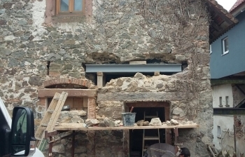 Anstelle des ursprünglichen Fensters wurde die Mauer als adäquates Bruchsteinmauerwerk ergänzt und eine höhere und breitere Türöffnung mittels HEB-Träger realisiert, ohne dass Betonauflager etc. sichtbar blieben.