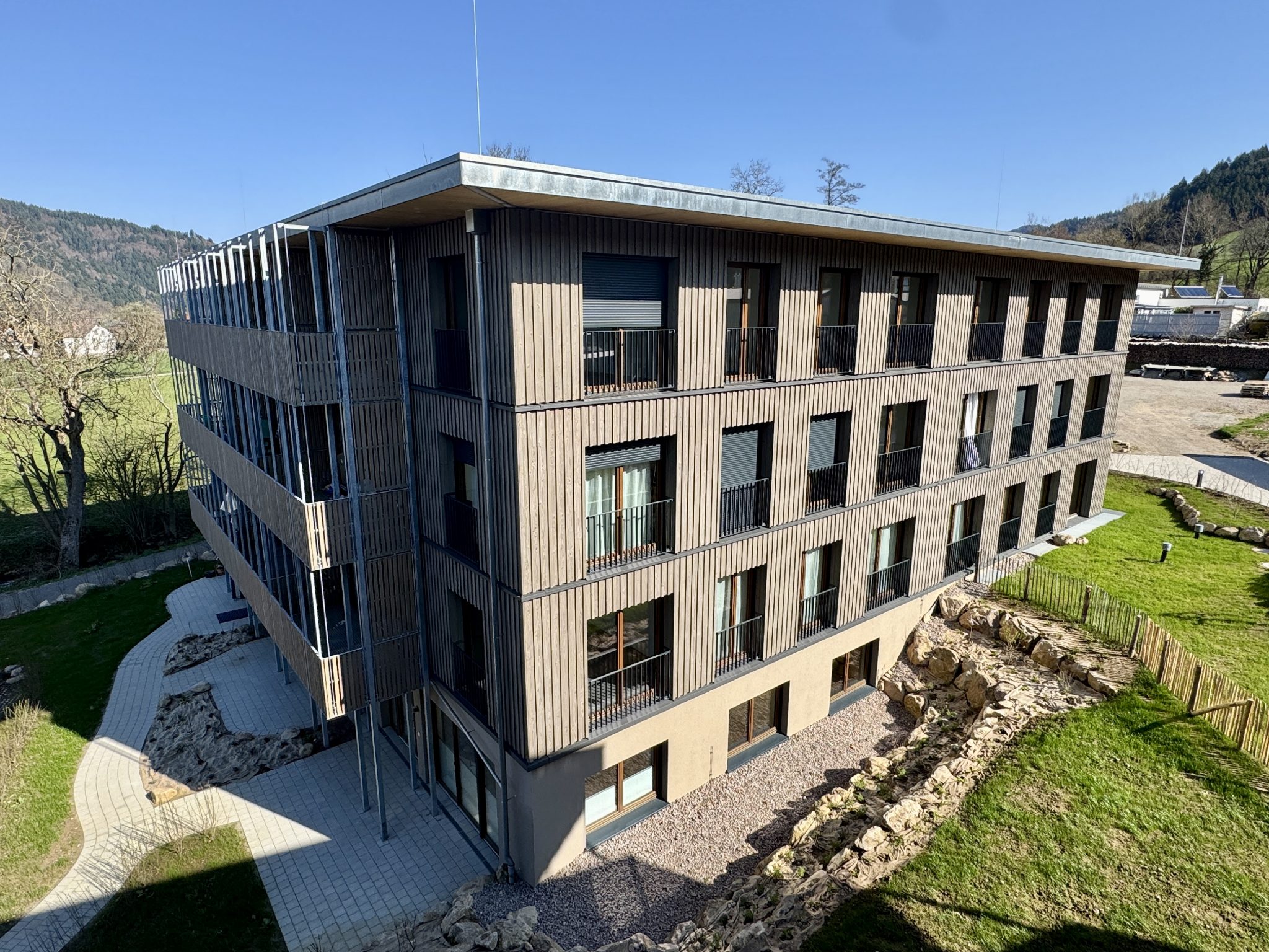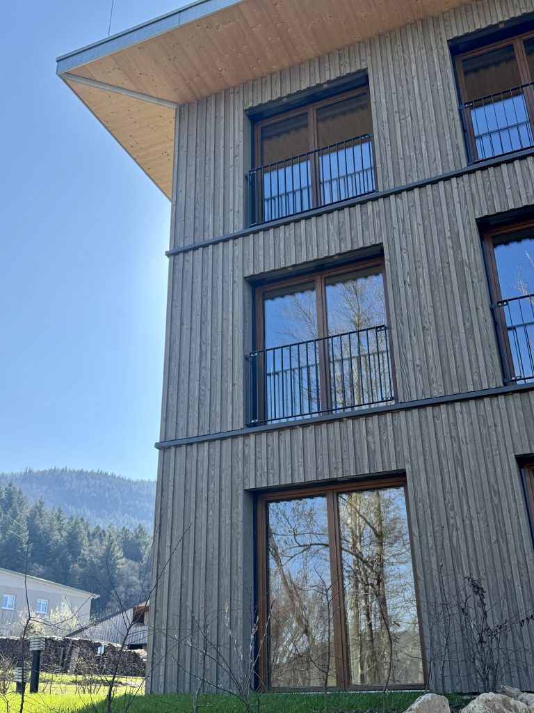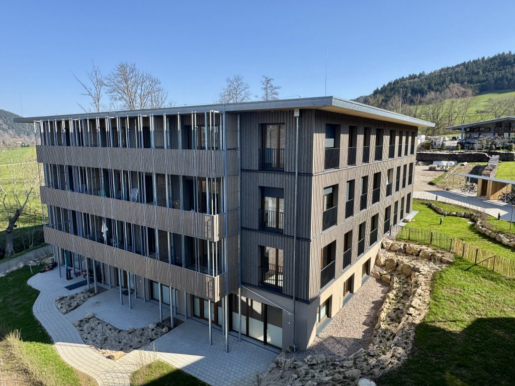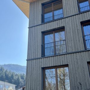Um seinen Mitarbeitern und Mitarbeiterinnen bezahlbaren Wohnraum in der Nähe der Arbeitsstätten anbieten zu können, entschied sich unser langjähriger Kunde für den Bau eines hybriden Geschosswohnungsbaus am Fuße des Waldkircher Hausberges. Das Halbkellergeschoss wurde in massiver Stahlbetonbauweise als wasserundurchlässiges Bauteil erstellt. An der darüberliegenden Stahlbetondecke schließen sowohl das Treppenhaus als auch der aus Stahlbeton erstellte Aufzugsschacht als aussteifende Massivbauteile für den gesamten Holzbau der 3 Vollgeschosse an. Der kubische Baukörper hat eine Grundfläche von knapp 500m2. Bereits während das Team Massivbau die Stahlbetonarbeiten ausführte, war die Konstruktionsabteilung mit Hochdruck an der Abbund- und Elementierungsplanung der Außen- und Innenwänden sowie der Deckenscheiben. Durch einen sehr hohen Vorfertigungsgrad eine hohe Fertigungstiefe sowie die Logistik im eigenen Hause konnte ein ambitionierter Bauzeitenplan in Realität umgesetzt werden.